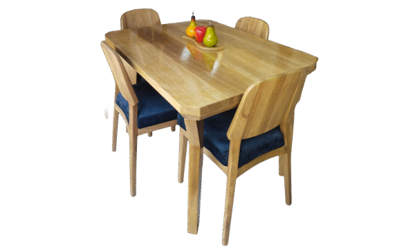 Este conjunto de comedor para cuatro personas combina la calidez de la madera con un diseño moderno y funcional. La mesa, de madera con un acabado natural, tiene una forma rectangular con bordes suavizados, lo que le da un aspecto orgánico y acogedor. Las cuatro sillas que la acompañan, también de madera, presentan un diseño único con un respaldo que se curva ligeramente, brindando un soporte ergonómico. Los asientos de las sillas están tapizados en una tela de color azul oscuro, que crea un contraste visual atractivo con el tono claro de la madera. Este conjunto es una excelente opción para salas de comedor o espacios de cocina que buscan un estilo contemporáneo y una funcionalidad cómoda para el día a día.