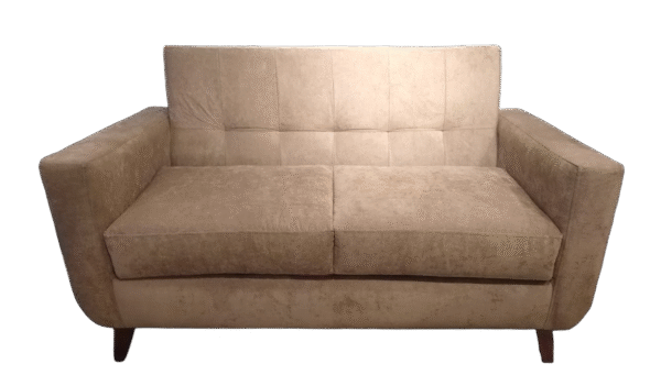 Este sofá es una pieza elegante y funcional, ideal para espacios pequeños como un apartamento, una oficina o un rincón de lectura. Su diseño combina un respaldo recto con brazos curvados que le dan un toque moderno y acogedor. El respaldo tiene un patrón de costuras horizontales que añaden un detalle de diseño sutil. La tapicería es de una tela suave con una ligera textura, en un color café claro o beige oscuro, que es versátil y fácil de combinar. Las patas cónicas de madera oscura le dan estabilidad y complementan el tono de la tela.