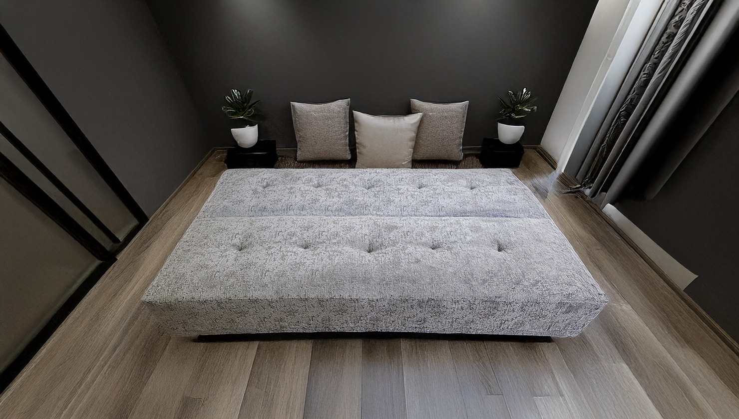 Sofá de una sola pieza con capacidad para tres o más personas. El diseño es minimalista con líneas rectas y limpias. Los cojines son fijos y el respaldo es acolchado