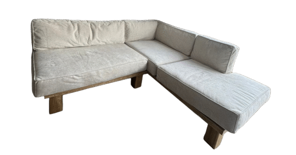 Este sofá seccional ofrece una combinación de funcionalidad y diseño minimalista, ideal para quienes buscan un mueble adaptable. Su configuración modular en “L” permite una gran versatilidad para acomodarse en diferentes espacios. El diseño se caracteriza por sus líneas rectas y limpias, con un marco de madera visible que le da un toque orgánico y natural. La tapicería es una tela de color beige claro con una textura sutil de lino o algodón, que lo hace ideal para crear un ambiente cálido y acogedor. Los cojines de asiento y de respaldo son voluminosos y sueltos, lo que contribuye a una sensación de confort casual y relajado